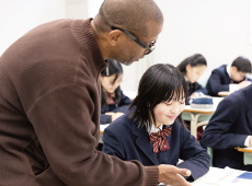本校ではネイティブ教員を専属の教員として配置しており、授業はもちろん、さまざまな体験学習に携わっています。生徒たちが学校生活のあらゆる場面で、生きた英語と触れ合う機会を提供しています。