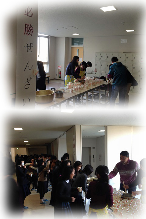 2014年1月3日、高校3年生のセンターマラソン参加者に、本校教員から『必勝ぜんざい』が振る舞われました。